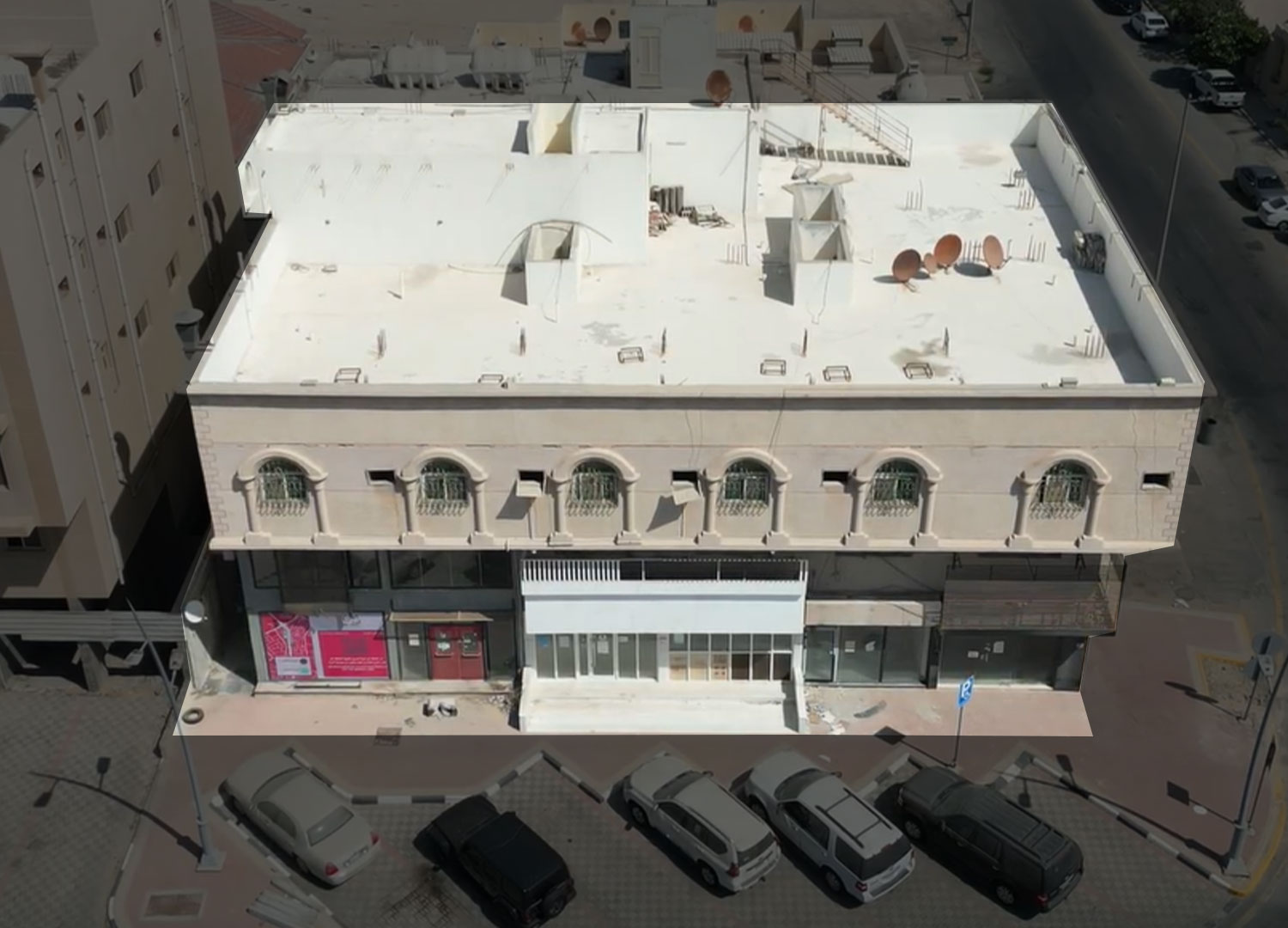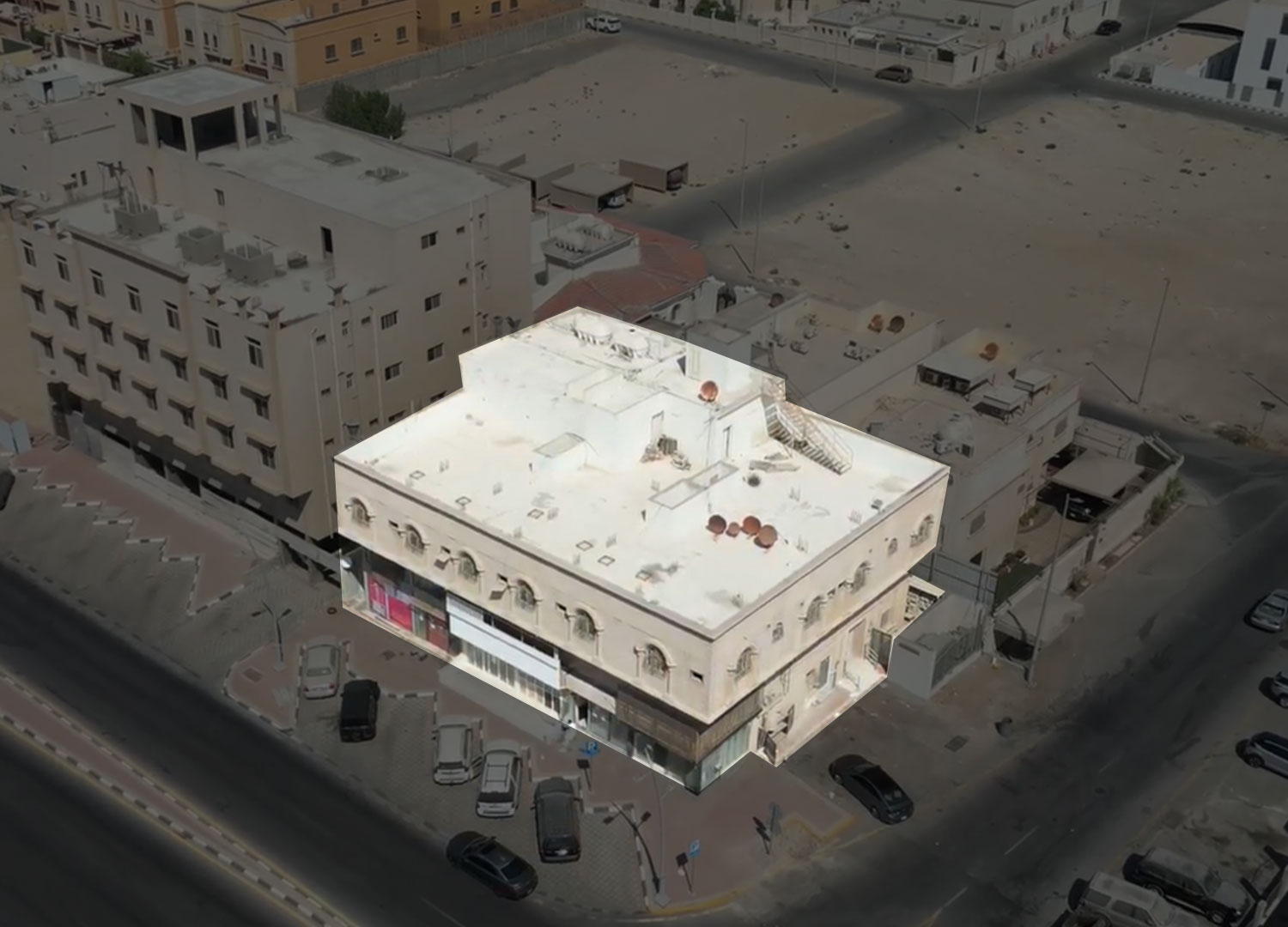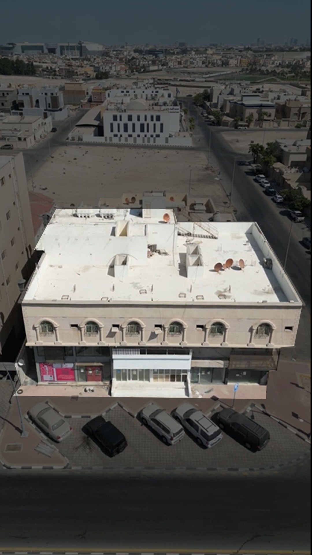 الدور الأرضي يتكون من : 6 محلات تجارية ومكتب ومجلس ودورتي مياه وحوش خلفي يحتوي علي (دورة مياه وغرفة بسقف شينكو)