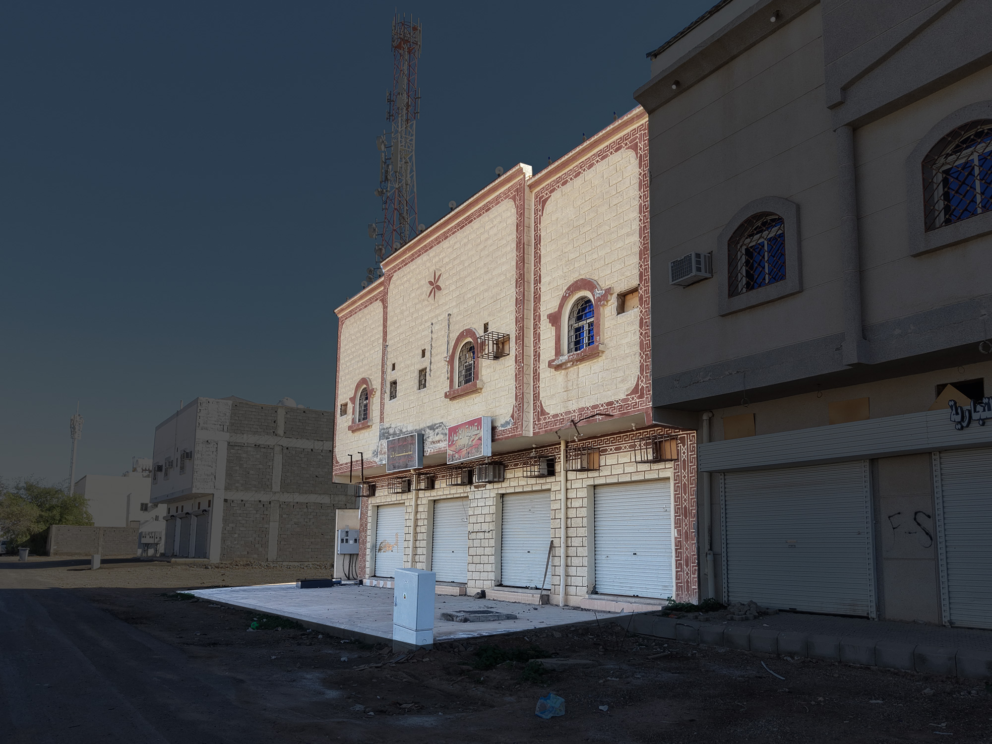 الشقة الثانية تتكون من: 3 غرف ومجلس وملقط وصالة ومطبخ ومستودع ودورتي مياه - يوجد جزء من صندوق خدمات بالجهة الشمالية للعقار خارج حدود العقار.